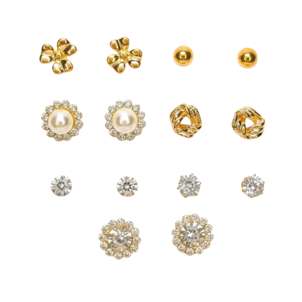 Kit de brincos semaninha com 7 pares banhados em dourado, trazendo um mix elegante e versátil. O conjunto inclui flores delicadas, pontos de luz cravejados, argolinhas torcidas, modelos com pérola central e detalhes sofisticados em strass. Uma seleção completa para variar o look durante a semana, equilibrando o clássico e o moderno em acessórios que iluminam qualquer produção.