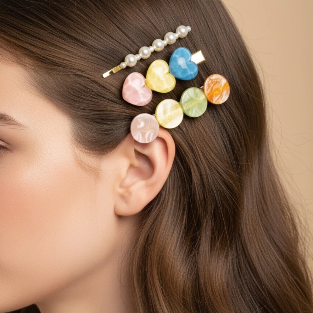 Um kit cheio de cor e leveza para iluminar qualquer visual! Esse conjunto traz três presilhas modernas e delicadas: a primeira com mini pérolas alinhadas, perfeita para um toque clássico; a segunda com corações em resina nas cores rosa, amarelo e azul, super romântica e divertida; e a terceira com círculos iridescentes em tons candy (rosa, amarelo, verde e laranja), trazendo frescor e personalidade. Um mix equilibrado entre delicadeza e estilo, ideal para compor looks descontraídos ou dar um ponto de cor em produções elegantes.