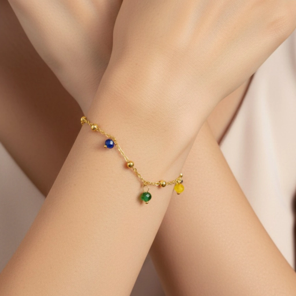Pulseira delicada com banho dourado, que ilumina o visual e garante sofisticação. O design é composto por corrente leve, intercalada por esferas polidas e pingentes de pedras naturais facetadas em azul, amarelo e verde, remetendo às cores vibrantes do Brasil. Uma peça única, que une delicadeza e estilo — perfeita para compor looks cheios de personalidade, seja em combinações ou usada sozinha.
