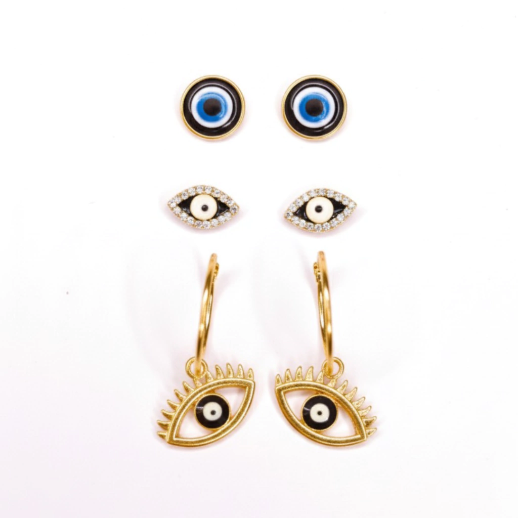 Trio de brincos banhados em dourado com design sofisticado e cheio de significado. O conjunto traz um par de brincos redondos em vidro azul estilo olho grego tradicional, um par de brincos em formato de olho com zircônias cravejadas que destacam o centro esmaltado, e um par de argolas médias com pingente de olho estilizado em dourado, trazendo um visual moderno e protetor. Uma combinação perfeita entre moda, simbologia e elegância para usar em diferentes ocasiões.